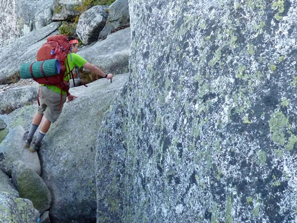 Holding onto an iron bar in order to gain a little extra leverage on slippery rock faces.