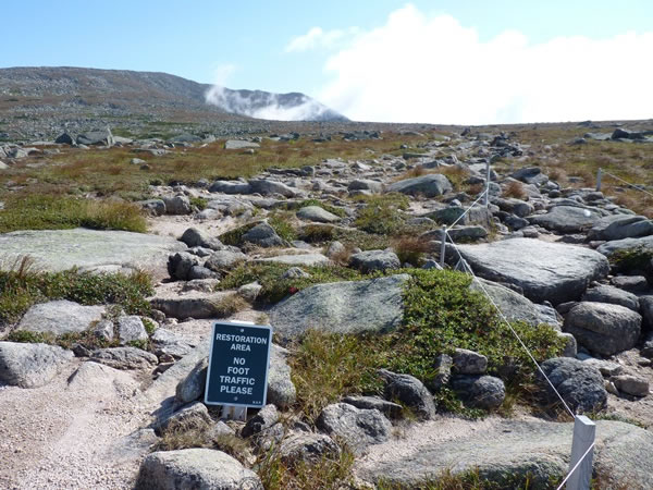 Hopefully, fragile alpine plants will, in due course, come to cover the previous path. Even though clouds continued to shroud Mt Katahdin’s south-eastern flanks, I was encouraged by the fact that at this stage of the morning – at 10:00 am – there was still a lot of clear blue sky both above me and above the summit of the mountain. |