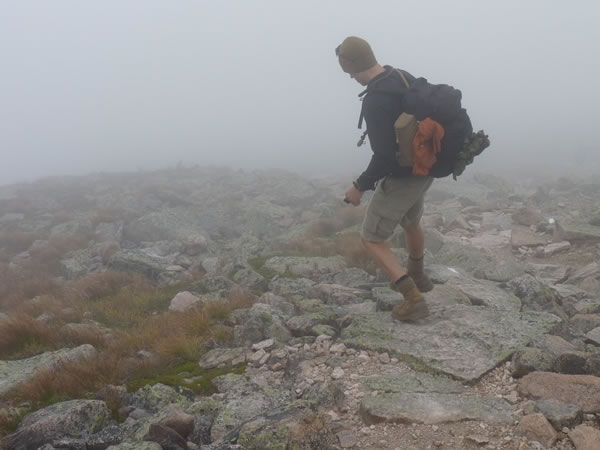 At 11:05 am – after little more than twenty minutes on the summit of Mt Katahdin – I started my descent in fairly thick mist.