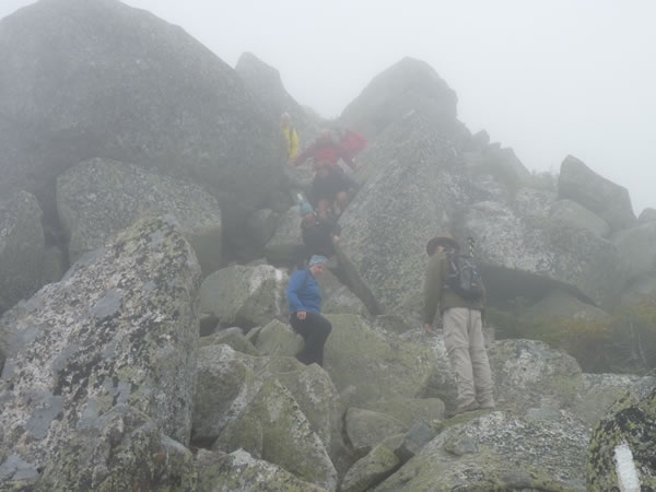 Seven hikers in the mist, clambouring down through part of the boulder field. Mik Cooper and Christiana Whitcomb are in the middle of the group.