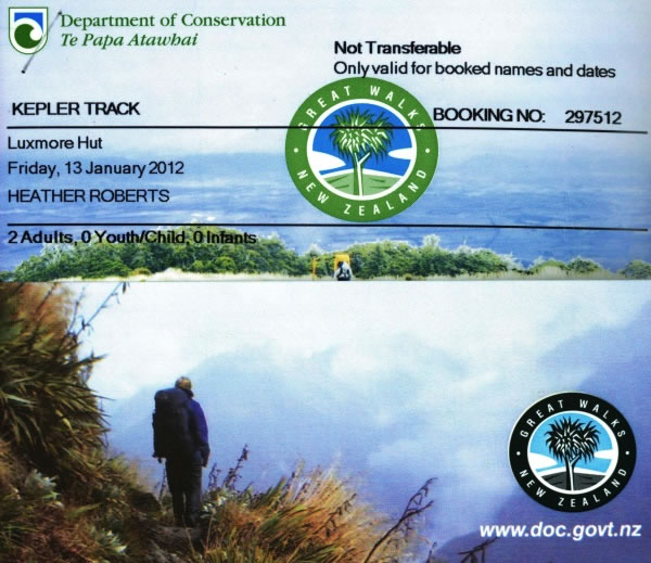 The Kepler Track is one of New Zealand’s Great Walks – and one of the great things about the Great Walks is that during peak season everyone has to have a hut booking, which means that everyone is guaranteed bunk space: slow walkers and late-comers don’t miss out on a bed. This is the pre-booked and pre-paid ticket that Heather and I had for our night in Luxmore Hut. |