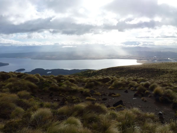 After my quick excursion to the Luxmore cave, I collected my pack and at 8:35 am began climbing up the slopes of Mt Luxmore. Heather and Jiff, knowing they’d likely be slower than me, had gone on ahead. At this stage, the weather seemed as though it could be okay: looking back down onto Lake Te Anau, with the town on the right-hand edge of the picture, there was even a little sunshine. |