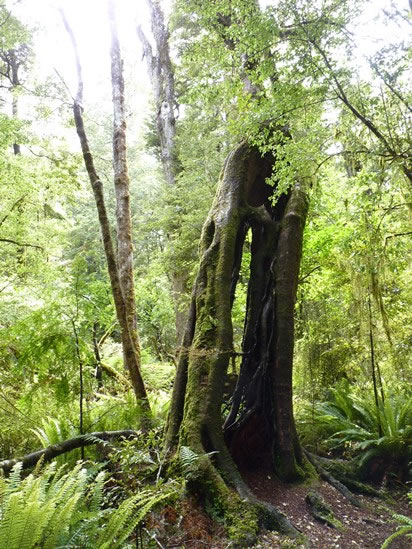 Despite the fact that the trunk of this tree had been split completely open, the tree was still growing and had a canopy of green leaves.