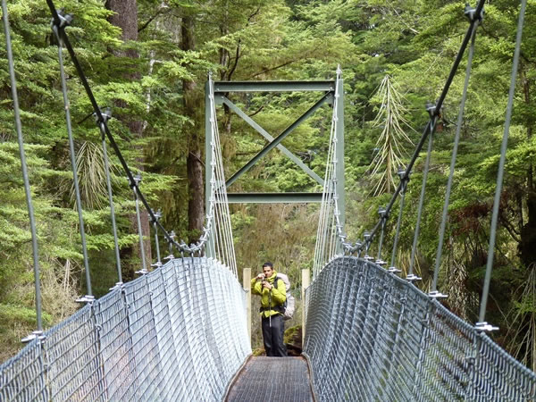 David Pages photographing a swing bridge that crosses an ox-bow loop on the Waiau river.
