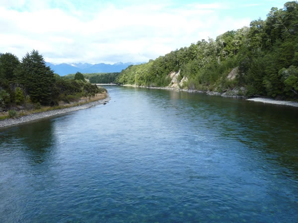 Looking down the Waiau river from the middle of the Rainbow Reach bridge.