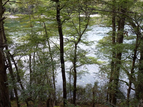 A glimpse down through the trees on the true right bank of the Waiau river to the river itself.