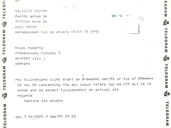 After a lot of difficulty, involving frantic telegrams and telex messages, I finally – less than a week before I was scheduled to start climbing Mt Kilimanjaro – received confirmation that I’d successfully booked to climb the mountain. |