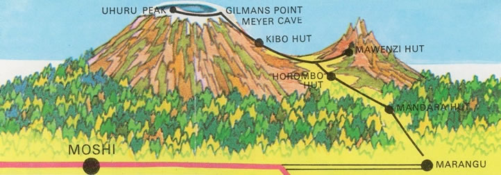 Similarly, this is a diagram from an East African Airways brochure entitled East Africa’s Magnificent Mountains illustrating “the most common way” for “the ascent of Kibo”. Nowadays there’s a range of routes for ascending Mt Kilimanjaro: from west to east, the best known are the Shira, the Machame, the Umbwe, the Mweka, and the Marangu routes. Given that I’d already been on the Marangu route (when I attempted to climb Kilimanjaro in 1959), I’d have loved to have climbed the mountain via one of the other routes, but – sadly – it wasn’t really a viable option in 1985. |