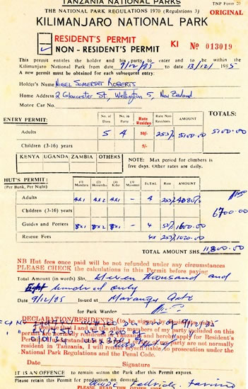 … paying a total of 11,800 Tanzanian shillings – almost $US200 apiece for the four of us – for our non-residents’ entry permits and for hut fees for ourselves and our guides and porters.