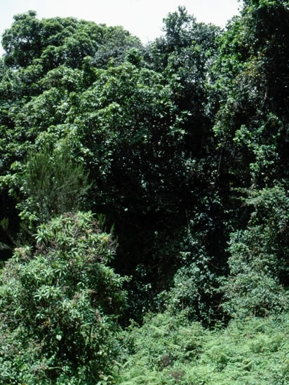 Most of the first day’s hike from the Marangu Gate to the Mandara huts is through the montane forest zone, which has an average of 1,800 millimetres / 70 inches of rain per year. In their book, Journey Through Tanzania, Mohammed Amin, Duncan Willetts, and Peter Marshall note that the forest “is a mass of great trees – camphor, cedar, juniper, olive and pillar – many twisted into fantastic shapes and festooned with lianas, mosses and lichens. Luxurious foliage forms a dense canopy, and only occasionally sunshine breaks through to dapple the ferns and bushes of the thick undergrowth.” |