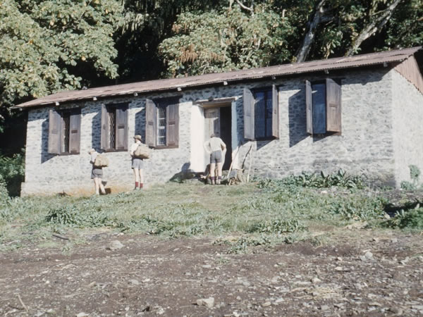 … Bismarck’s Hut, and this is a photograph that I took of it on Christmas morning 1959 when I first tried to climb Mt Kilimanjaro. (In the picture, from left to right, are Ted Goodyer, Peter Hamilton, and Derek Suckling.) |