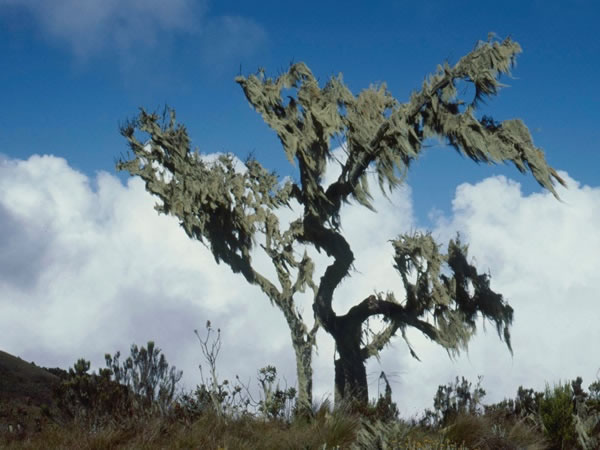 A close up of two old lichen-festooned trees on the rim of the Maundi crater.