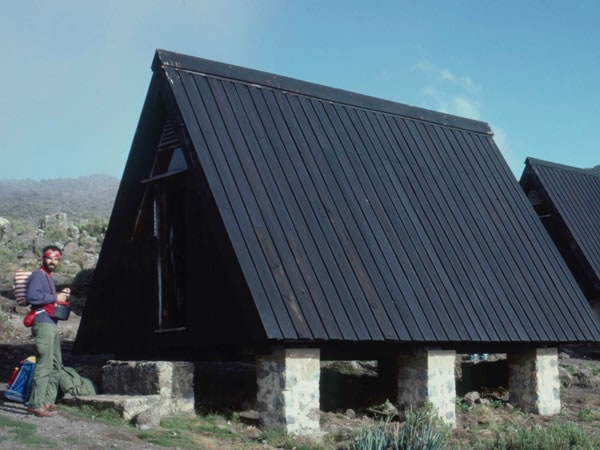 We left Horombo at 8:15 am on Wednesday, 11 December 1985. In this picture, Simone – carrying his comparatively small red-and-white striped day-pack and his comparatively large camera bag – prepares to leave the hut we stayed in. |