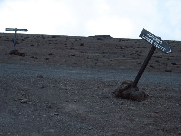 A fork in the path across the saddle. We had come on the lower route from Horombo, and were heading west (left in this picture).