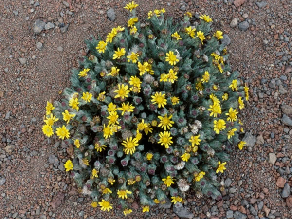 Much of the saddle is sandy and stony; vegetation is sparse and sporadic. As a result, this clump of what I think is ragwort (or