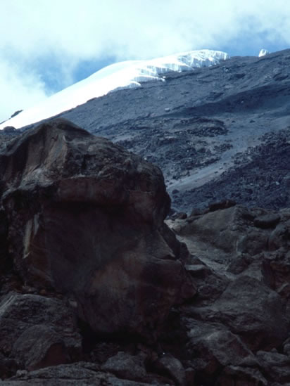This telephoto view looks at the Rebmann glacier, a part of Kibo’s southern icefields.