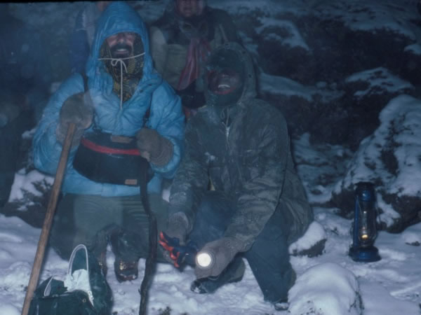 At 1:23 am on Thursday, 12 December 1985, the remaining eight of us set off, heading initially for Gillman’s Point on Kibo’s crater rim. It had started snowing around the time we went to bed, so the scree and rocks were covered with a light coating of snow. The first time we stopped, I took this picture of Simone and an assistant guide (who, in addition to holding a torch / flashlight, is also holding my gloves, which I had to take off in order to operate my camera). |