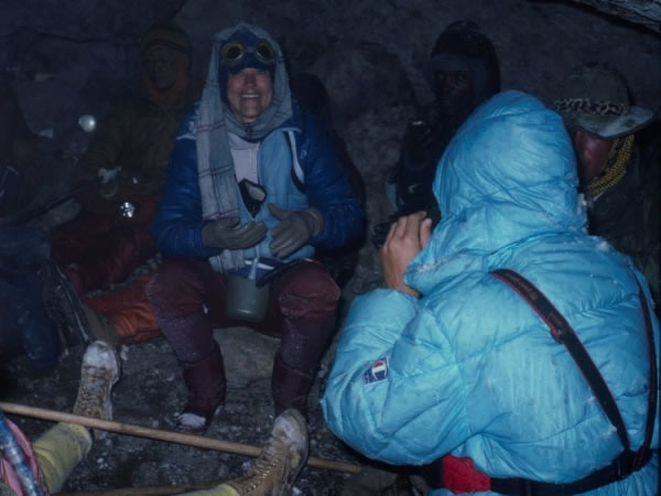 We stopped for a longer rest in the Hans Meyer cave, which was thankfully drier and warmer than our first stop. Murriell McCulley was looking very cheerful. She suffered no ill effects whatsoever from the altitude, and – despite the fact that she’d done no special training for the climb (except, she joked, for hanging out the washing) – she was very fit. Donia McCulley’s yellow trouser legs and boots are visible in the left-hand foreground. She too had a trouble-free climb, but her younger sister, Dori, had given up after only half an hour. I knew exactly how she felt: I’d done the precisely the same thing in 1959. Simone’s ungloved hand shows that he too was busy taking photographs. |
