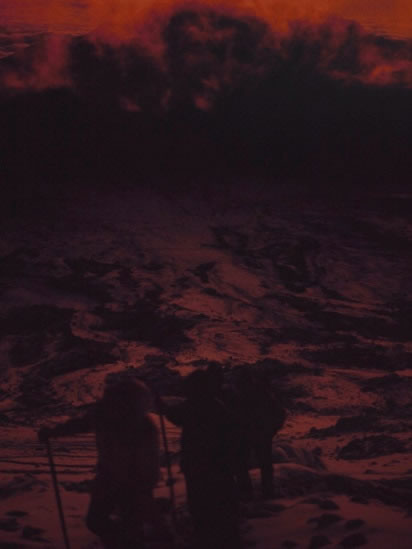 I took this picture sometime after 5:30 am, looking down onto three climbers below me zig-zagging (or, as the say in the United States, switch-backing) their way up Kibo’s steep scree slopes. The pre-dawn red glow on the clouds and the snow was stunning. Half an hour earlier (somewhere around 5,500 metres / 18,000 feet above sea-level) , I’d experienced a brief but debilitating bout of nausea, but – thankfully – it disappeared after I bent down and breathed deeply, and the altitude didn’t trouble me again. As a result, I really enjoyed witnessing daybreak on Africa’s highest mountain, and felt very privileged. |