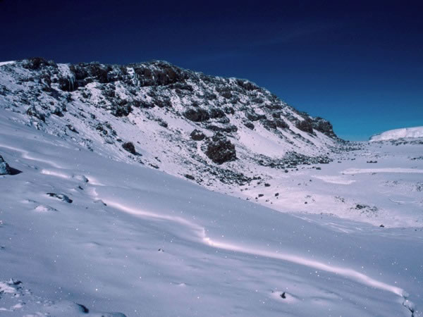 Looking across at Kibo’s southern crater wall and up at Uhuru Peak, the highest point on the horizon. The Furtwängler Glacier is visible at the right-hand edge of the picture.