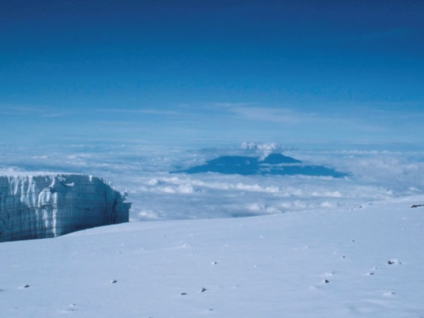 On the left is the tip of the Decken glacier (which forms part of the southern icefields), while Mt Meru (4,565 metres / 14,977 feet) is in the centre of the picture.