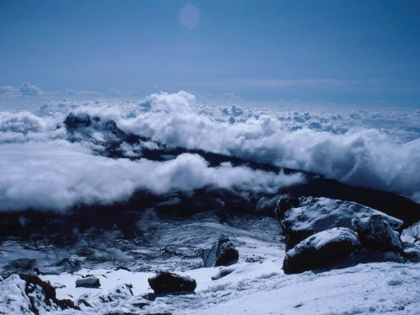 The descent from the summit of Kilimanjaro to Gillman’s Point took us only about three-quarters of an hour (that is, an hour less than the ascent). This is a picture taken at Gillman’s Point looking down onto the saddle and across towards Mawenzi. |