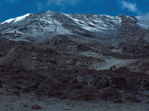 Looking back up at Gillman’s Point, the highest point on the skyline (which is about one-third the way in from the left-hand edge of the picture). The dark scar that was the route we took to run down the scree was made more obvious by the snow surrounding it. Less obvious, however, is … |