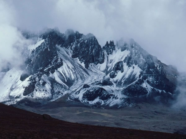 After an hour and three-quarters, we left Kibo Hut at 12:15 pm and started hiking back across saddle, heading for the Horombo huts. While we were walking across the saddle, I used a telephoto lens to take this photograph of Mawenzi covered with a light mantle of snow and surrounded by swirling clouds. |