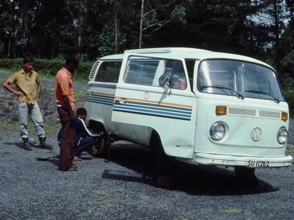 The Tanzanian State Travel Service VW Kombi was at the Marangu Gate to meet us when we finished the climb, but we discovered one of the van’s rear tyres was flat, and before the STS staff could drive us down to the Kibo hotel (thus saving us a 5 km walk), the wheel had to be changed. |