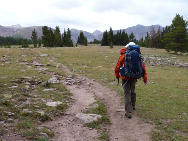 We continued to walking south, along the eastern edge of the Henry's Fork Basin, and – for the first time – Kings Peak came into view. It's the pyramid-like peak in the centre of the picture (to the left of Eric).