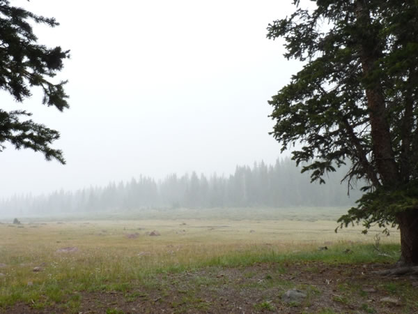Looking out from beneath some conifers while the snow shower swirled around us.