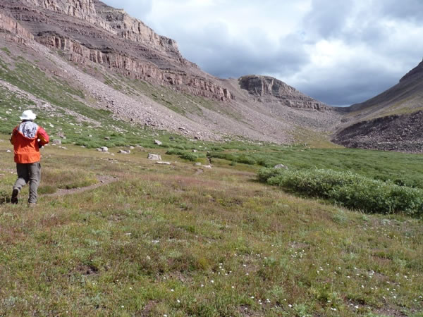 Nearing Gunsight Pass – the notch on the skyline on the right-hand side of the picture – we paused. Eric put down his pack and went on a recce to see whether or not we were on the correct trail (a fallen signpost near the grazing sheep had confused us). Eric not only concluded we were literally on the right track, but also reported he'd seen a reasonable spot for camping. |
