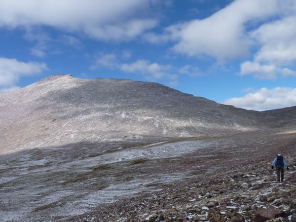 Once we were over the rocky spur's ridge-line, the going got easier and we also had a good view of Kings Peak. We were heading for Anderson Pass, near the notch in the skyline above Eric's head.