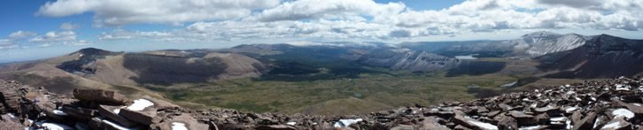 A four-shot panorama looking east and east south east from the summit of Kings Peak. The Painter Basin is in the centre of the picture, while the Atwood Basin (with Lake Atwood in the middle of the basin) is on the right-hand edge of the picture.