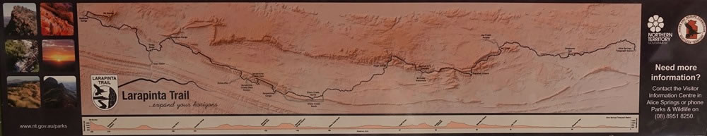 Introduction: This is a photograph of a map that was on one of the many information signs that we came across. It is of the whole of Larapinta Trail, which goes from Alice Springs (at the right-hand edge of the picture) along the spine of the West MacDonnell mountain ranges to Redbank Gorge and Mt Sonder, which are at the western end of the 230-kilometre trail (and which are on the left-hand edge of the map). |