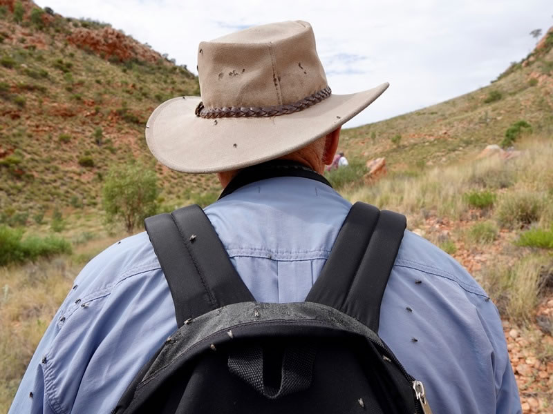 Day 1 (Friday, 28 April 2023) – The Ormiston Pound Walk: “The heat, the dust, and the flies” is a common cry in the Australian outback. Our first day’s walk was distinguished by the fact that it was both the hottest, with temperatures in the high 20s (degrees C), and it also had the most flies (as this picture that I took of Bob shows, there were a lot of them!). The maximum temperatures on the rest of the trip were usually in the low 20s, and we never again encountered many flies. |