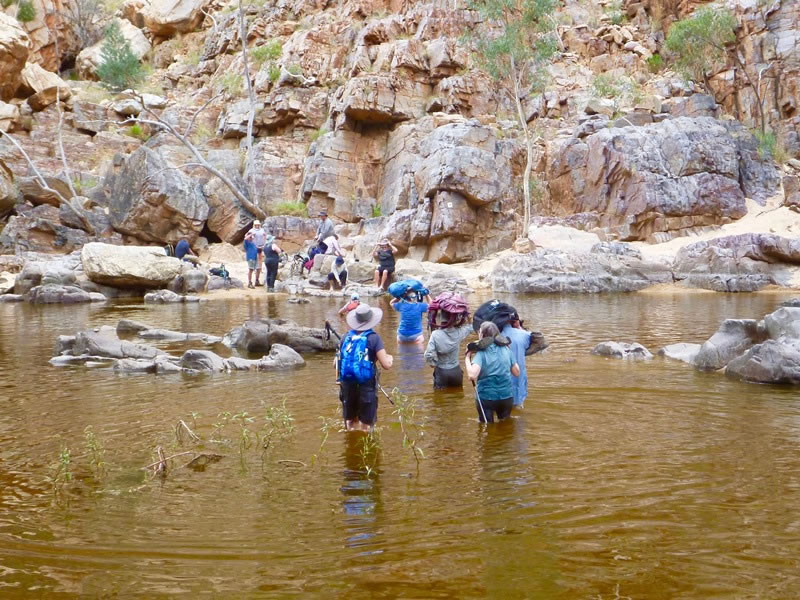 Day 1 (Friday, 28 April 2023) – The Ormiston Pound Walk: … where – as the notices at the start of the track put it – “wading through cold water [is] required.” In this photograph, members of another trekking party have already crossed the creek, as have Deb and Stephen, while Heather, Libby, Melissa, Ella, Peggy, and Bob are in the water. |