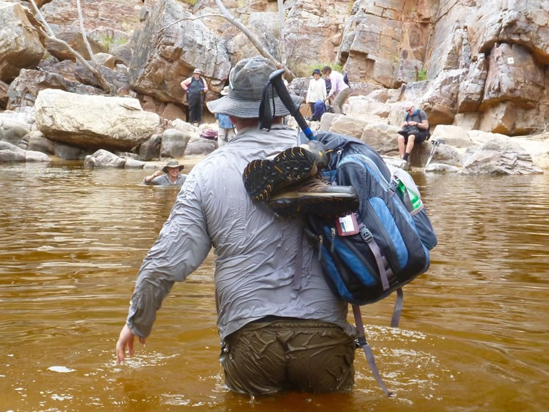 Day 1 (Friday, 28 April 2023) – The Ormiston Pound Walk: The fact that the water was supposedly cold was not a problem. What the information signs could have said, though, was that the creek was fairly deep and the rocks in it were slippery. As this picture (which I took with my small waterproof camera) shows, several of us – including me, Ella (who’s facing me up to her chest in water), and the other trekking party’s guide – got quite wet! |