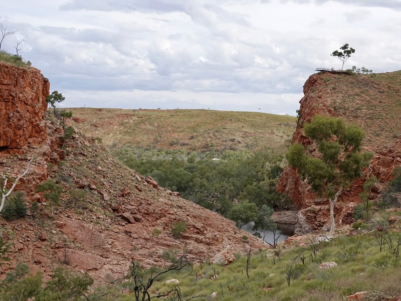 The viewing platform above the cliffs on the right-hand side of the gorge, as well as – in the middle of the picture – one of the buildings near the Ormiston Gorge camping grounds.