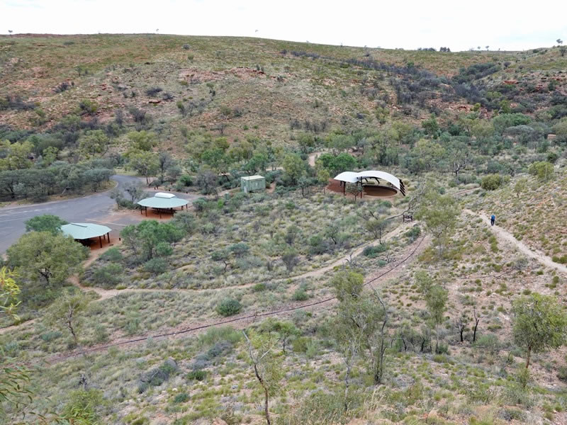 Day 1 (Friday, 28 April 2023) – The Ormiston Pound Walk: … the shelters near the Ormiston Gorge camping grounds, which was where our first day’s hike began and ended. We finished the Ormiston Pound Walk (which was a little over 10 kilometres long) shortly after 5:00 pm. All told, including an hour’s break for lunch, the Ormiston Pound Walk had taken us a little over five-and-a-half hours. |