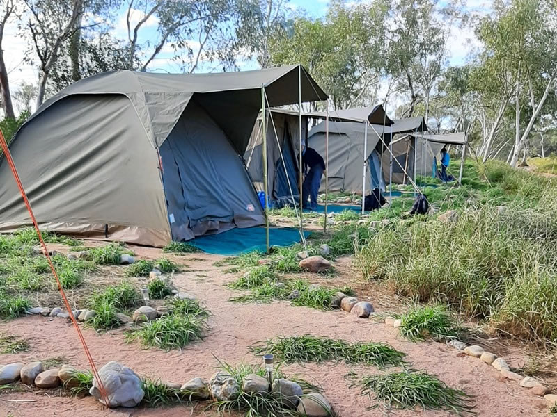 Days 1 to 6 (28 April to 3 May 2023) – Our trektours Australia campsite: This is a photograph that Heather took looking across from our changing room tent towards the tent that we slept in. The next two tents were occupied by Libby and Stephen, and the two after that by Bob and Peggy (which is why Libby’s standing in front of tent 3 and Peggy’s in front of tent 6). |