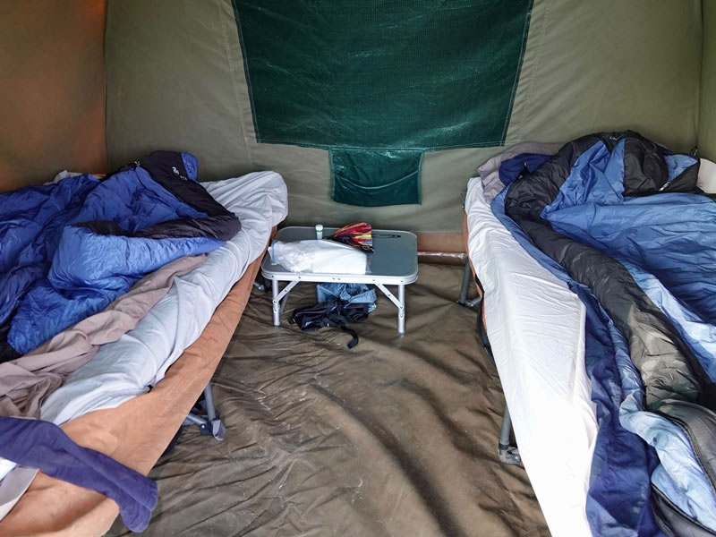 Days 1 to 6 (28 April to 3 May 2023) – Our trektours Australia campsite: Looking inside Heather’s and my bedroom tent. The tents were tall enough to stand in, and we slept in sleeping bags on top of camping mattresses on folding camp beds. All in all, we were pretty comfortable and I, for one, was never cold. |