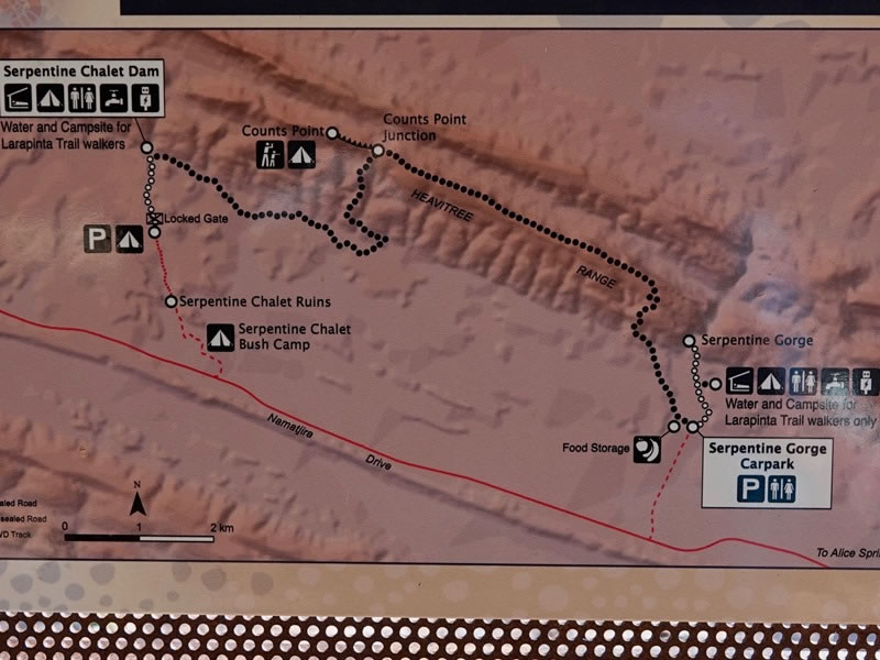 Day 2 (Saturday, 29 April 2023) – Section 8 of the Larapinta Trail (i.e., from the Serpentine Gorge Carpark to the Serpentine Chalet Dam): This is a photograph of a map of Section 8 of the trail that was on an information sign at the Serpentine Gorge Carpark. |
