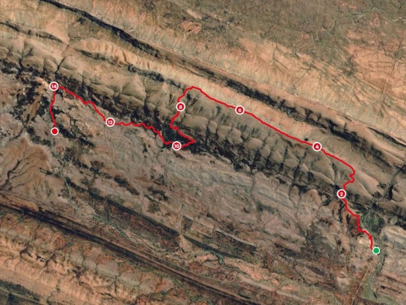 Day 2 (Saturday, 29 April 2023) – Section 8 of the Larapinta Trail (i.e., from the Serpentine Gorge Carpark to the Serpentine Chalet Dam): Superimposed on a satellite photograph of the area, this MapMyWalk map that I created shows where we went. We climbed up onto the Heavitree range, then had a lovely four-kilometre walk along its ridgeline, before dropping down to the Serpentine chalet area on the southern flanks of the range. |