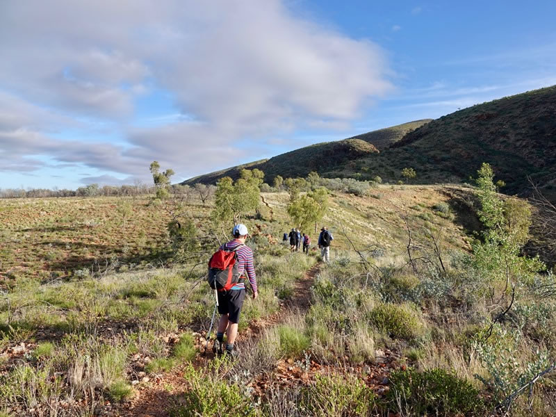 Day 2 (Saturday, 29 April 2023) – Section 8 of the Larapinta Trail (i.e., from the Serpentine Gorge Carpark to the Serpentine Chalet Dam): We started hiking at 7:45 am, initially through some of the gently undulating foothills of the Heavitree range. |