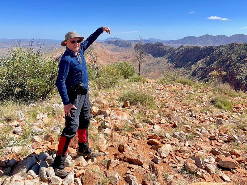 Day 2 (Saturday, 29 April 2023) – Section 8 of the Larapinta Trail (i.e., from the Serpentine Gorge Carpark to the Serpentine Chalet Dam): Bob took this photo of me pointing at Mt Sonder, the western end of the Larapinta Trail, which appeared to be a very long way away. |