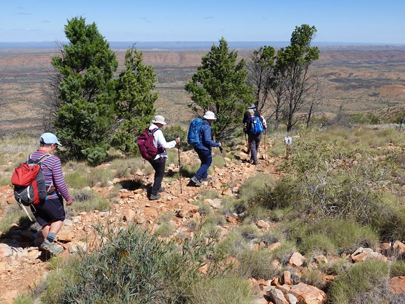 Day 2 (Saturday, 29 April 2023) – Section 8 of the Larapinta Trail (i.e., from the Serpentine Gorge Carpark to the Serpentine Chalet Dam): At 1:00 pm, almost two hours after we first arrived at the Counts Point junction, we began heading down the southern slopes of the Heavitree range. From left to right are Heather, Deb, Melissa, Libby, and Stephen. |