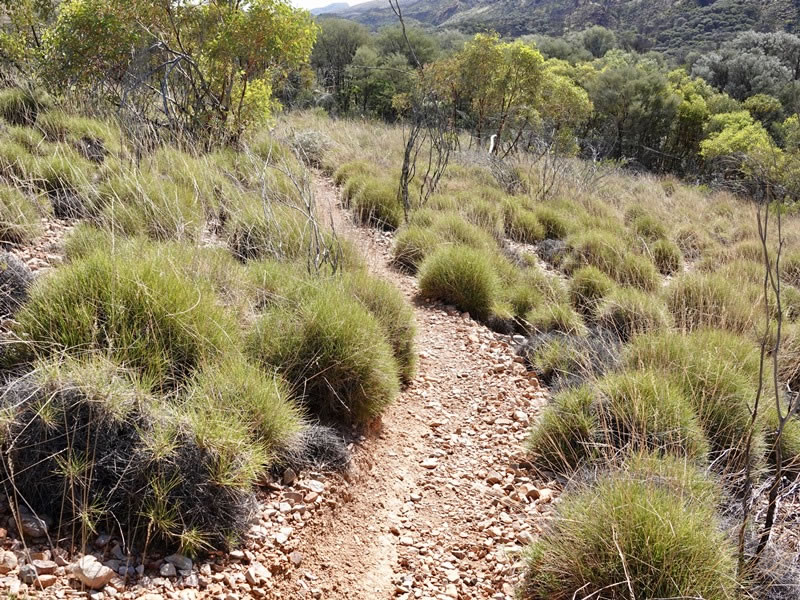 Day 2 (Saturday, 29 April 2023) – Section 8 of the Larapinta Trail (i.e., from the Serpentine Gorge Carpark to the Serpentine Chalet Dam): In May 2013, almost exactly ten years before Heather and I were hiking sections of the Larapinta Trail on this trip, I had been to Australia’s red centre together with my Canberra-based climbing-partner, Eric Hodge, in order to climb the highest mountains in South Australia and the Northern Territory. On that trip, our nemesis was spinifex. Its sharp, spiky leaves contain silica which makes them stiff and rigid, and their spear-like points can easily pierce several layers of clothing. For good reason, spinifex is sometimes also called porcupine grass. As a result, I wasn’t looking forward to the possibility of having any close encounters with spinifex while I was on the Larapinta Trail. I needn’t have worried. As this photograph shows, because the Larapinta Trail is a clearly-defined, well-used trail, it’s possible to walk utterly unscathed between the spinifex bushes. Whew, I confess I was really relieved. |