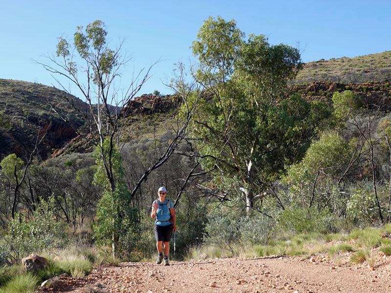 Day 2 (Saturday, 29 April 2023) – Section 8 of the Larapinta Trail (i.e., from the Serpentine Gorge Carpark to the Serpentine Chalet Dam): However, the shelter near the Serpentine Chalet Dam was not the end of our day’s walk. In order to get to a spot where the trektours van could pick us up, we still had what I thought was another kilometre or so to go, so Heather and I started walking again at 4:15 pm … |