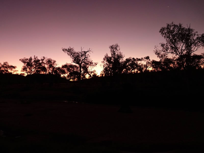 Day 2 (Saturday, 29 April 2023) – Section 8 of the Larapinta Trail (i.e., from the Serpentine Gorge Carpark to the Serpentine Chalet Dam): While we were having dinner, I took this photograph at 6:40 pm looking west across the riverbed beside our camp. |